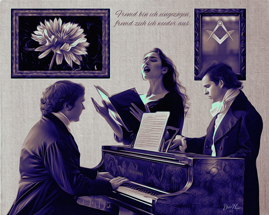 Eine ältere Dame liebt die Vertonung des romantischen Gedichtzyklus „Die Winterreise“ von Wilhelm Müller durch Franz Schubert. Als Klavierschülerin hat sie von ihrem Onkel vor fast sechzig Jahren die Noten hierzu bekommen. Die Idee eines fiktiven gemeinsamen Auftritt der beiden Künstler war geboren. Das Bild schmückt das Musikzimmer der Besitzerin.
