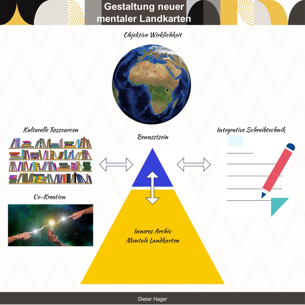 Unser gesamter Erfahrungsschatz ist in Form von Schlüsselgedanken und Schlüsselbildern netzwerkartig im Unterbewusstsein gespeichert. Diese Wissens- und Erfahrungsnetze kann man sich wie innere Landkarten vorstellen mit einer unendlichen Zahl von Knotenpunkten, Weggabelungen, Verzweigungen, Zentren und Unterzentren. Wird einer der Knoten dieses Wissensnetzes angeknipst – d.h. richten wir unser Denken auf einen bestimmten Fokus oder Brennpunkt aus – so wird auch gleich eine Anzahl von Nachbarknoten beleuchtet, aktiviert und zu Bewusstsein gebracht. Welcher Teil unserer inneren Landkarte aktiv ist, hat entscheidenden Einfluss auf Wohlbefinden und Handlungsfähigkeit. Der Grund hierfür liegt darin, dass die innere Landkarte jedes Menschen sowohl hilfreiche als auch blockierende gedankliche Verzweigungen enthält.