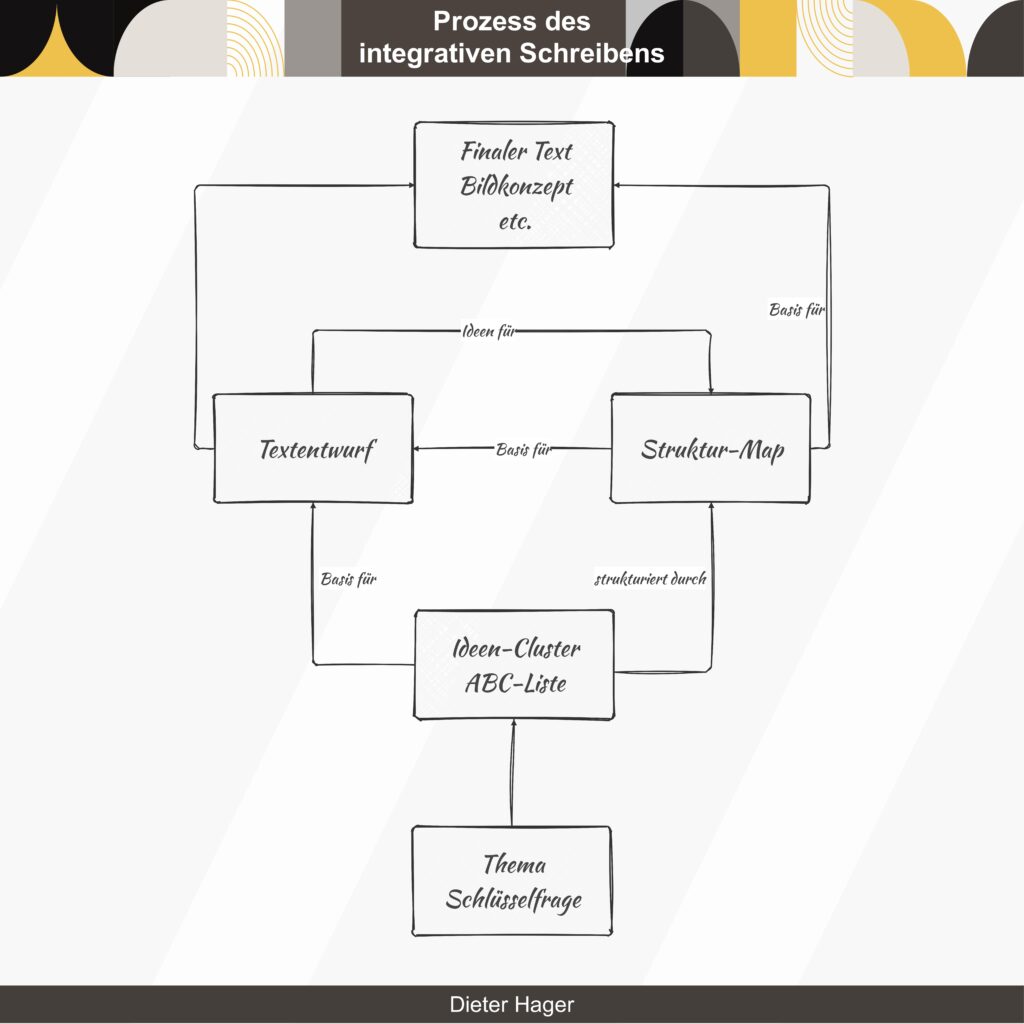 Hierauf aufbauend kann ein erster Textentwurf oder die Gestaltung einer differenzierten Struktur-Map erfolgen. Beide Schreibformate befruchten sich gegenseitig und münden in einen gehaltvollen finalen Text, ein ausformuliertes (Bild-)Konzept o.ä. ein.