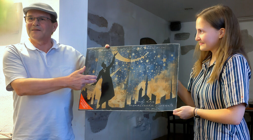 Diese Aussage stammt – wer wüsste das nicht – von dem Königsberger Philosophen Immanuel Kant, der im 18. Jahrhundert gelebt und wie kaum jemand vor und nach ihm an die Kraft zum mündigen Denken jedes Menschen geglaubt hat. Die Freude Kants an dem, was er den „Kategorischen Imperativ“ genannt hat, habe ich versucht in einem Bild auszudrücken. Diese Freude ist auf Malin übergeschwappt und zusammen haben wir dem Werk den letzten Schliff gegeben. Am vergangenen Freitag ist es aus der Druckerei eingetroffen und liegt noch originalverpackt vor uns.