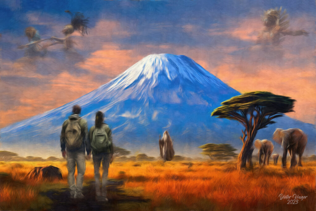 Eine Reminiszenz an das Hochzeitsbild: Linus und Marie auf dem Rückweg zum Basecamp nach dem Abstieg vom Gipfel des Kilimandscharo. Die Berggötter haben ihren Kampf aufgegeben und sich wohlwollend dem Bergsteigerpaar zugewandt. Die Tour zum Kilimandscharo ist heute Teil der gemeinsamen Erfahrungsschatzes von Linus und Marie. Ein wertvoller Baustein in der Erinnerung, der das Selbstvertrauen für bevorstehende Zukunftsprojekte stärkt, für neue und noch großartigere „Dinge“, die man gemeinsam lieben kann. Sie haben den Kilimandscharo gemeinsam bestiegen, sie werden auch die kommenden Aufgaben meistern. Für diesen mutigen Blick in die Zukunft auf der Grundlage gemeinsamer geglückter Erfahrungen steht vorliegendes Bild. „The best is yet to come!“ soll es ausdrücken nach dem Song von Cy Coleman aus dem Jahr 1959.